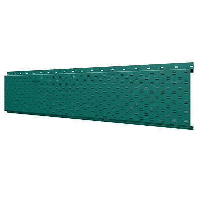 Линеарная потолочно-стеновая панель с ПЕРФОРАЦИЕЙ для вентиляции цвет RAL6026 Опал применяется в качестве софитов для подшивы крыши, наружной и внутренней отделки потолков, стен, фронтонов фасада дома в Нижнем Новгороде.