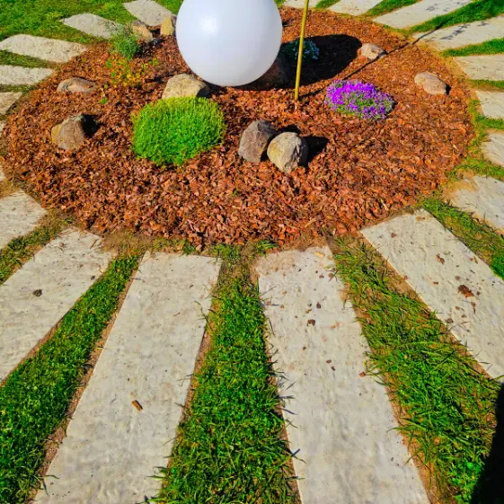 Фото 3 шаговая плита Stone Светлая Галька на оригинальной садовой дорожке