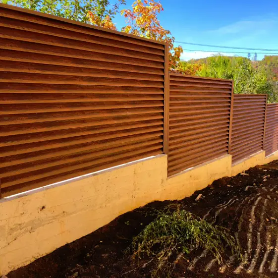 Забор Еврожалюзи Античное Дерево 3D Принтек двусторонний, Забор Еврожалюзи RAL8017 МАТТЕ Коричневый матовый двусторонний, Штакетник Полукруглый RAL8019 МАТТЕ Темный Шоколад двусторонний на заборе, Забор шахматка штакетник Широкий Античное Дерево 3D двусторонний, Колпак Everest Коричневый на столбах палисадника, Колпак Everest коричневый для столбов кирпичного забора