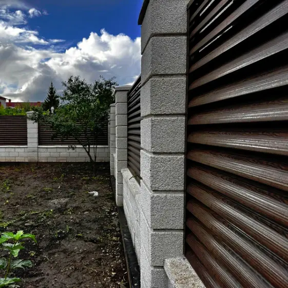 Секция забора жалюзи из ламелей еврожалюзи Темный Каштан 3D Принтек с кирпичными столбами анфас двусторонний
